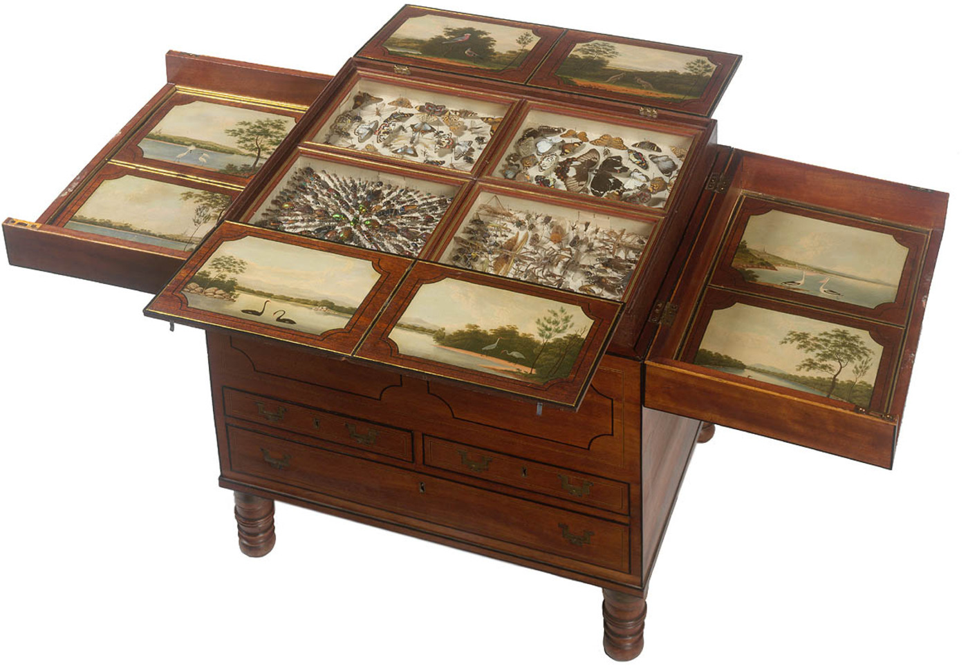 The top drawers of the chest contain collections of native Australian flora and fauna, including bugs and seashells arranged in ornate patterns, colourful birds that have been carefully preserved, and seaweed and algae specimens tucked away in concealed side drawers.